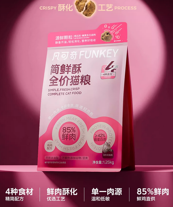 2025最全猫粮品牌排名.凡可奇是国产猫粮品牌,隶属吉家宠物集团;其品牌定位清晰,主打性价比路线,旨在为预算有限的铲屎官们提供价格亲民的猫粮选择。推出了多种特色产品,能够满足不同猫咪的口味需求;这里测评的是它家的新品:简鲜酥全价猫粮,主打鲜肉酥化,专注猫咪的本真需求。
