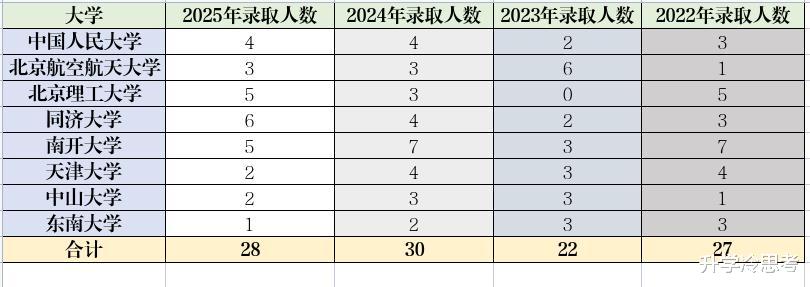 二、大庆铁人中学2025年高考有28人考入人大、北航、北理工等8所名牌大学笔者汇总整理了大庆铁人中学2022-2025年期间,考入中国人民大学、北京航空航天大学、北京理工大学、同济大学、南开大学、天津大学、中山大学、东南大学等8所名牌大学的人数情况,见下表。