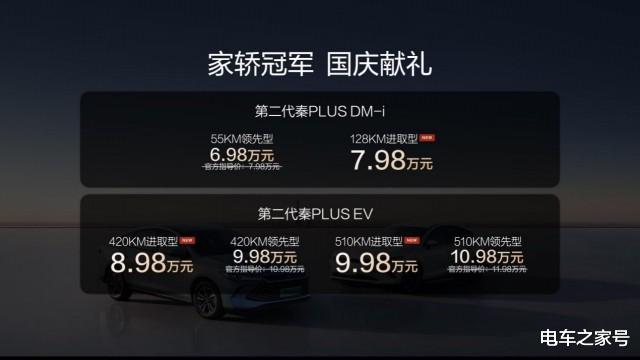 除了上新和OTA,为回馈广大用户的热爱,第二代秦PLUS带来国庆献礼价,全系车型限时6.98万元起,入门即享新车色、车载ETC、NFC钥匙、智能语音、VTOL移动电站等高端配置,将高品质家轿的门槛拉进了6万区间,为进取向上的中国家庭献上了一份国庆厚礼。