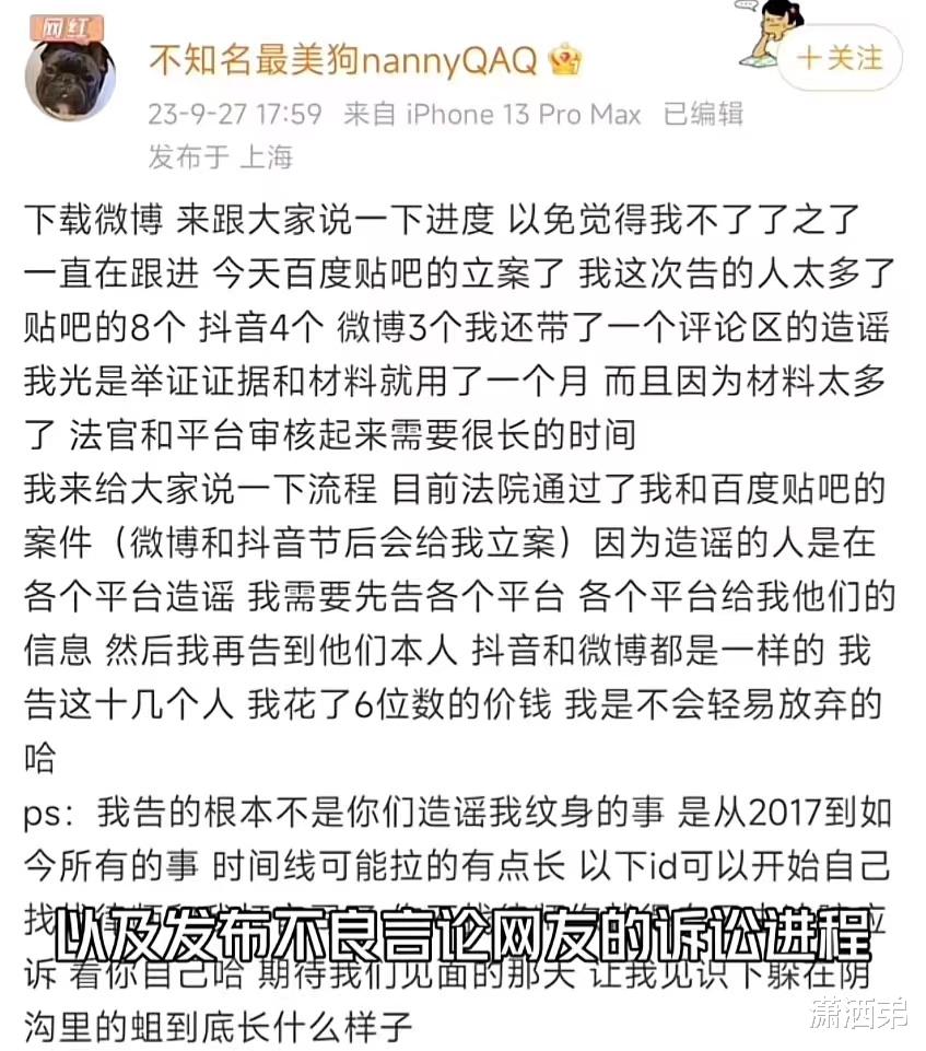 这一次奥咪咪告诉我们,这次她告的人很多。目前贴吧的有8个,抖音的4个,微博的3个。光是收集举证的那些材料,就花了一个月多月。而且因为材料太多了,法官也表示审核需要一定的时间。