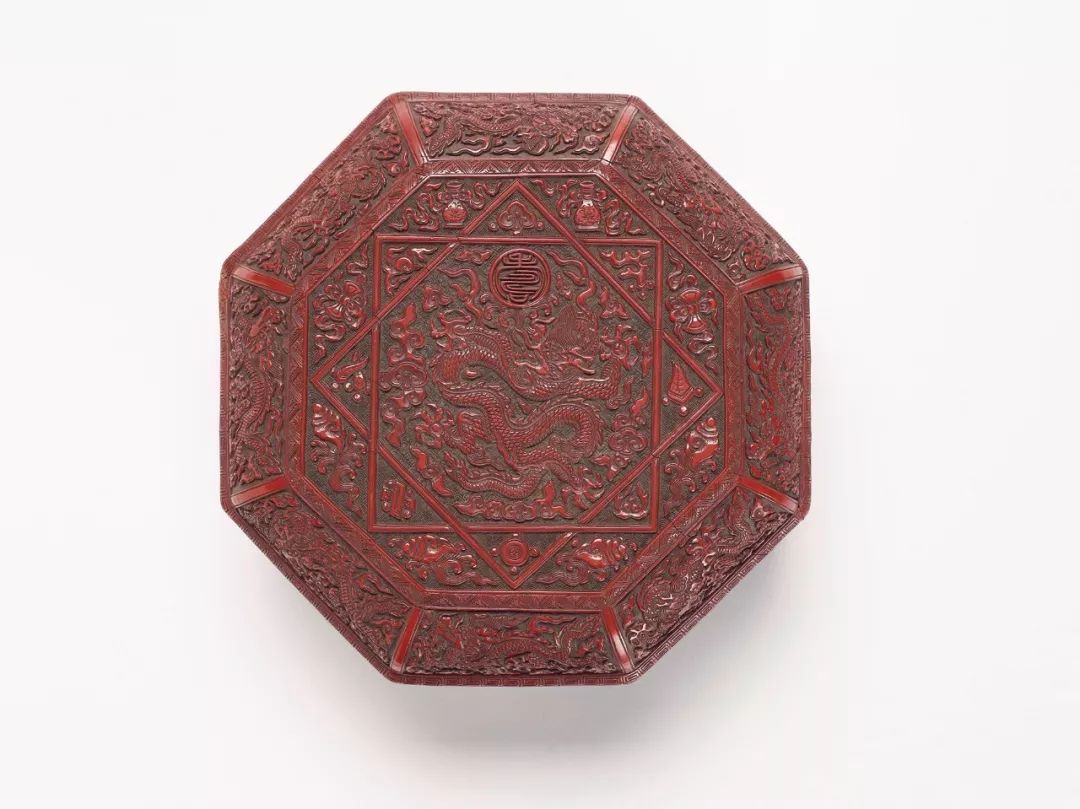 [明·嘉靖]剔红云龙捧寿纹八方盖盒 填金“大明嘉靖年制”楷书刻款