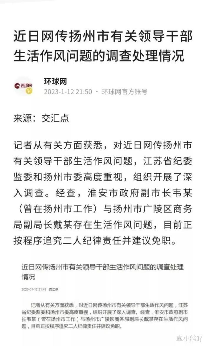 几天后,扬州市有关部门发布消息称,淮安市副市长魏锋和扬州市广陵区商务局副局长戴璐的生活方式出现了问题。