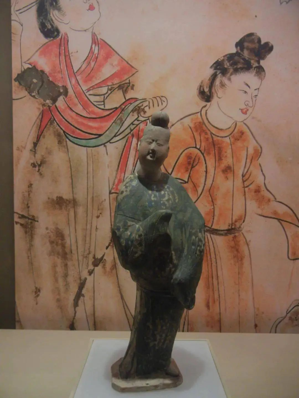 这位女俑所穿着的袍服是当时官宦男子穿着的常服,头戴幞头(fú头,又名折上巾、软裹,是一种包裹头部的纱罗软巾,通常为青黑色,也称“乌纱”,俗称为“乌纱帽”),俊朗洒脱中尽显自信从容。