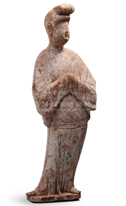 这位女俑头梳双股高髻,身着圆领袍服,腰间束带,足上穿靴,双手抱于胸前。虽然没有佩戴幞头,但一身都是男装,仪态自信,落落大方。