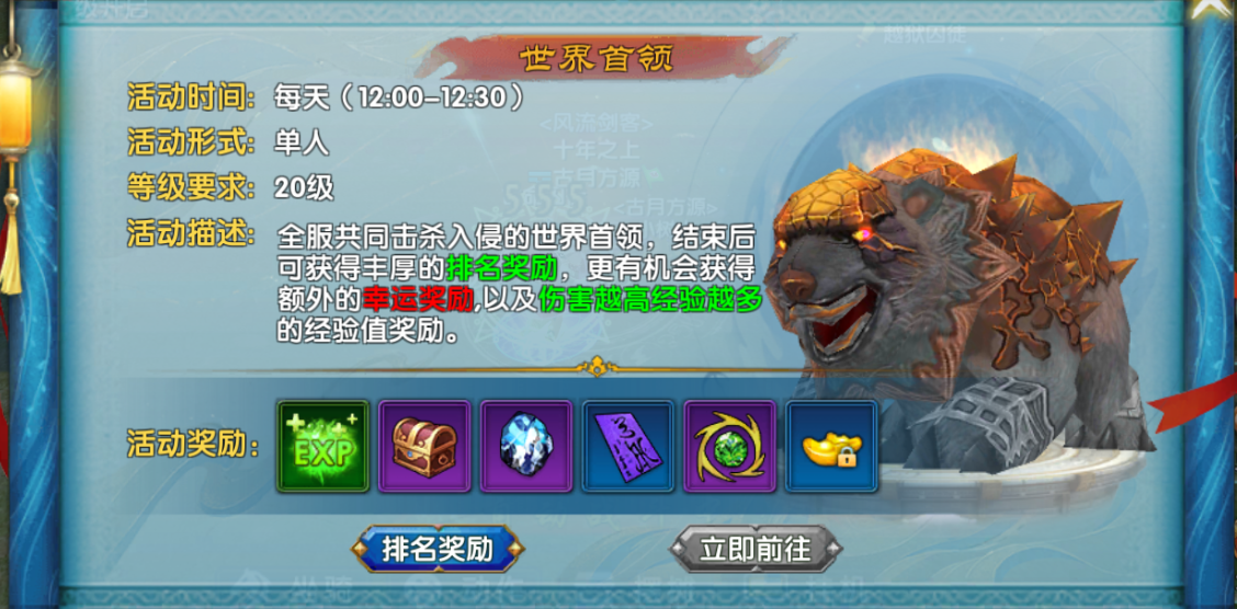 等级达 20 级后,“世界首领” 与 “历练任务” 同步开启,二者均为高收益限时玩法,需做好时间规划与战斗准备:
