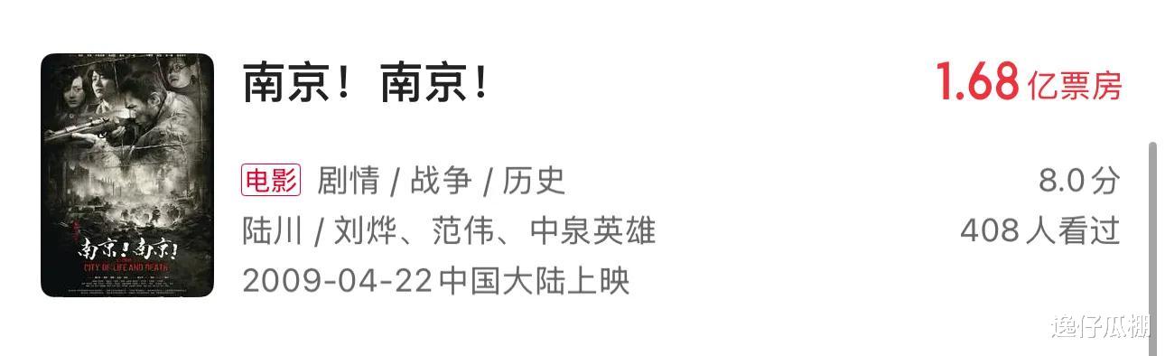 而从历史数据上看,2020年讲述淞沪会战“八佰壮士”的电影《八佰》以31.1亿的票房成为当年的票房冠军;而2009年同样是讲述南京大屠杀的《南京南京》收获了1.68亿票房,在16年前,这个成绩是绝对天花板级别的!