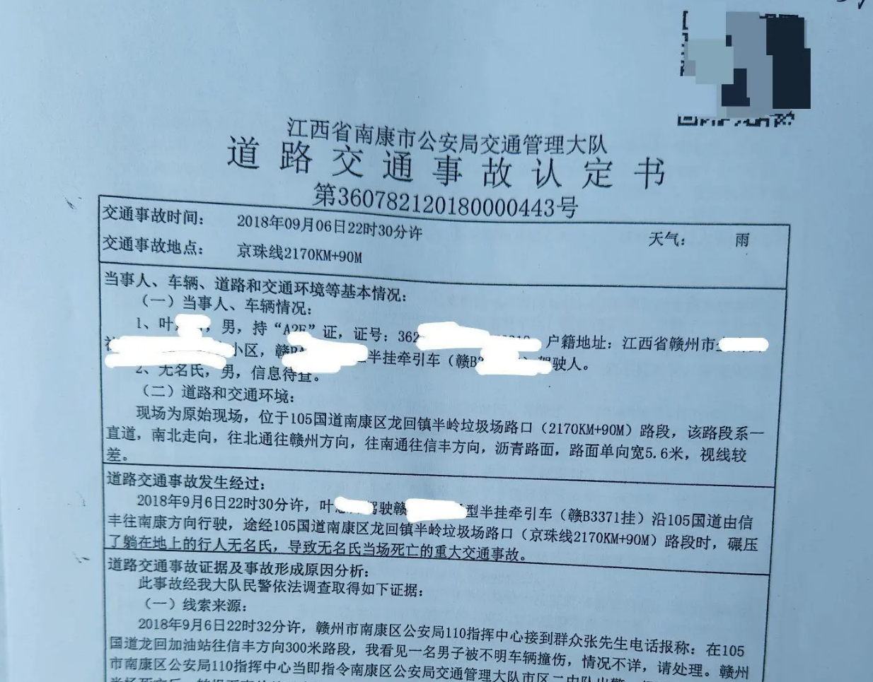 家人赶往江西交警部门核实,才得知当年的悲剧:2018年9月6日22时30分许,杨胜学在105国道南康区一回龙镇路段被一辆重型半挂牵引车碾压,当场死亡。因他未携带身份证、手机,且面部受损严重,警方当年未能确认其身份,以“无名氏”处理。