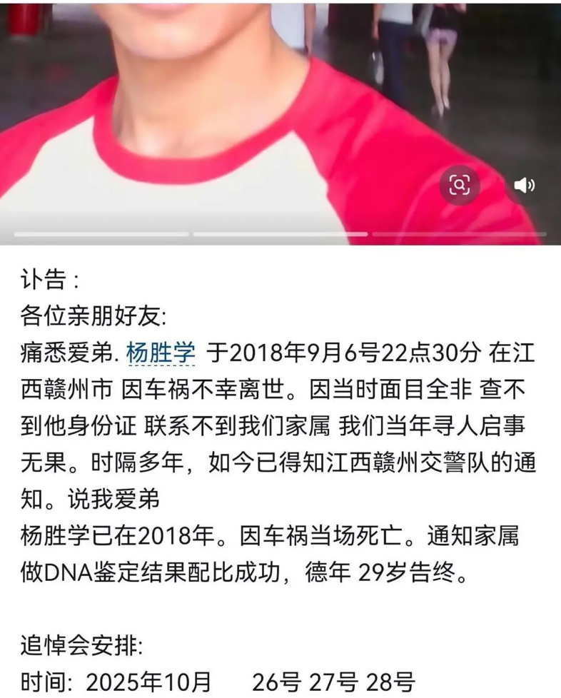 2025年10月,贵州安顺市镇宁县斗糯村的杨女士一家,终于收到了失踪七年的弟弟杨胜学的确切消息。只是这个他们苦寻多年的答案,来得太迟——29岁的杨胜学早在2018年9月6日夜间,已于江西赣州一场车祸中不幸身亡。