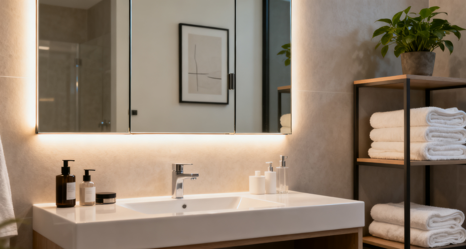 光影魔术:采用镜柜搭配柔和镜前灯,既能扩大空间感,又能消灭卫生间照明死角。