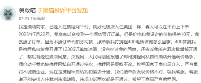 在黑猫投诉平台上,也有酒店商家对此进行投诉。携程平台辩称调价机制用于适应市场竞争,关闭需致电申请。郑州市市场监督管理局宣布立案调查并走访涉事酒店。