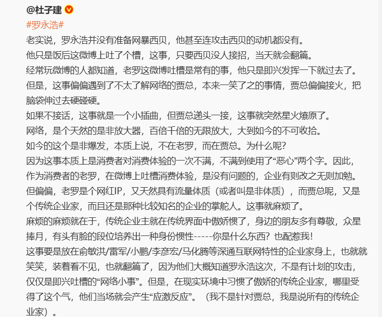 新浪微博“大V”杜子建说:“罗永浩并没有准备网暴西贝,他甚至连攻击西贝的动机都没有。他只是饭后在微博上吐了个槽,这事,只要西贝没人接招,当天就会翻篇。”