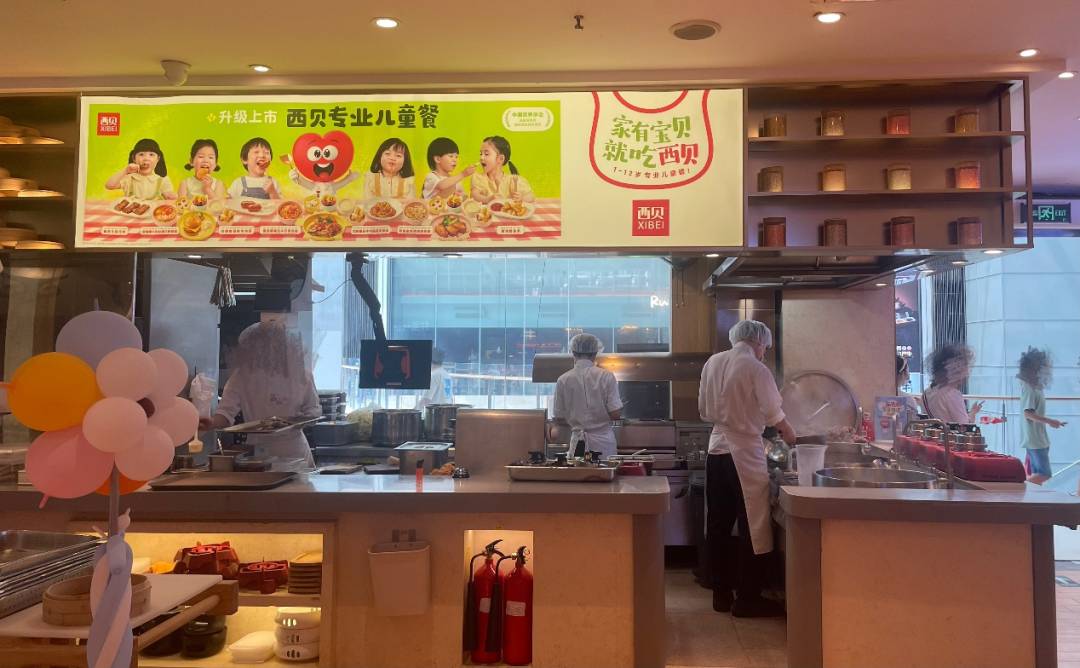 值得一提的是,据锌刻度观察,现场绝大多数的食客组合都是以家庭为单位,核心围绕着2至15岁左右的儿童、青少年。这与西贝门店的布置、服务与广告标语高度契合,从桌面提供的babycare联名纸巾、特意布置的儿童用餐区到菜单中单独列出的“专业儿童餐”板块,皆体现出西贝是一家“亲子友好餐厅”。