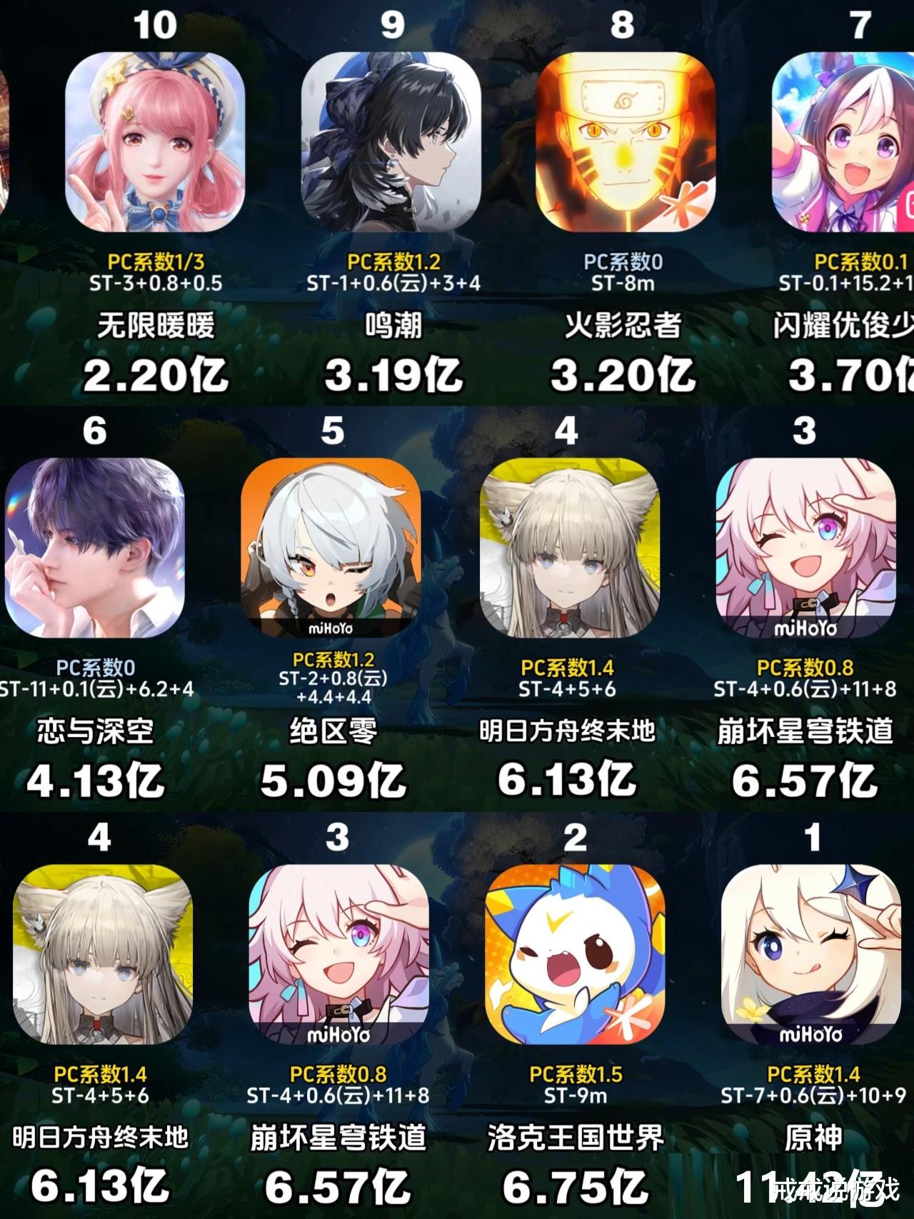 终末地这次倒是稳,虽然不是前三但也没掉出前列。鹰角这公司挺有意思的,从来不搞什么大新闻就是老老实实做内容。付费点主要靠皮肤,角色本身不逼氪玩家黏性高得离谱。有贴吧老哥调侃说鹰角看腾大哥卖付费皮肤赚翻了,估计也在琢磨是不是该学学。不过以鹰角的调性,大概率还是继续走自己的慢节奏路线。反正流水这东西看看就好别太当真,游戏好不好玩自己上手才知道。