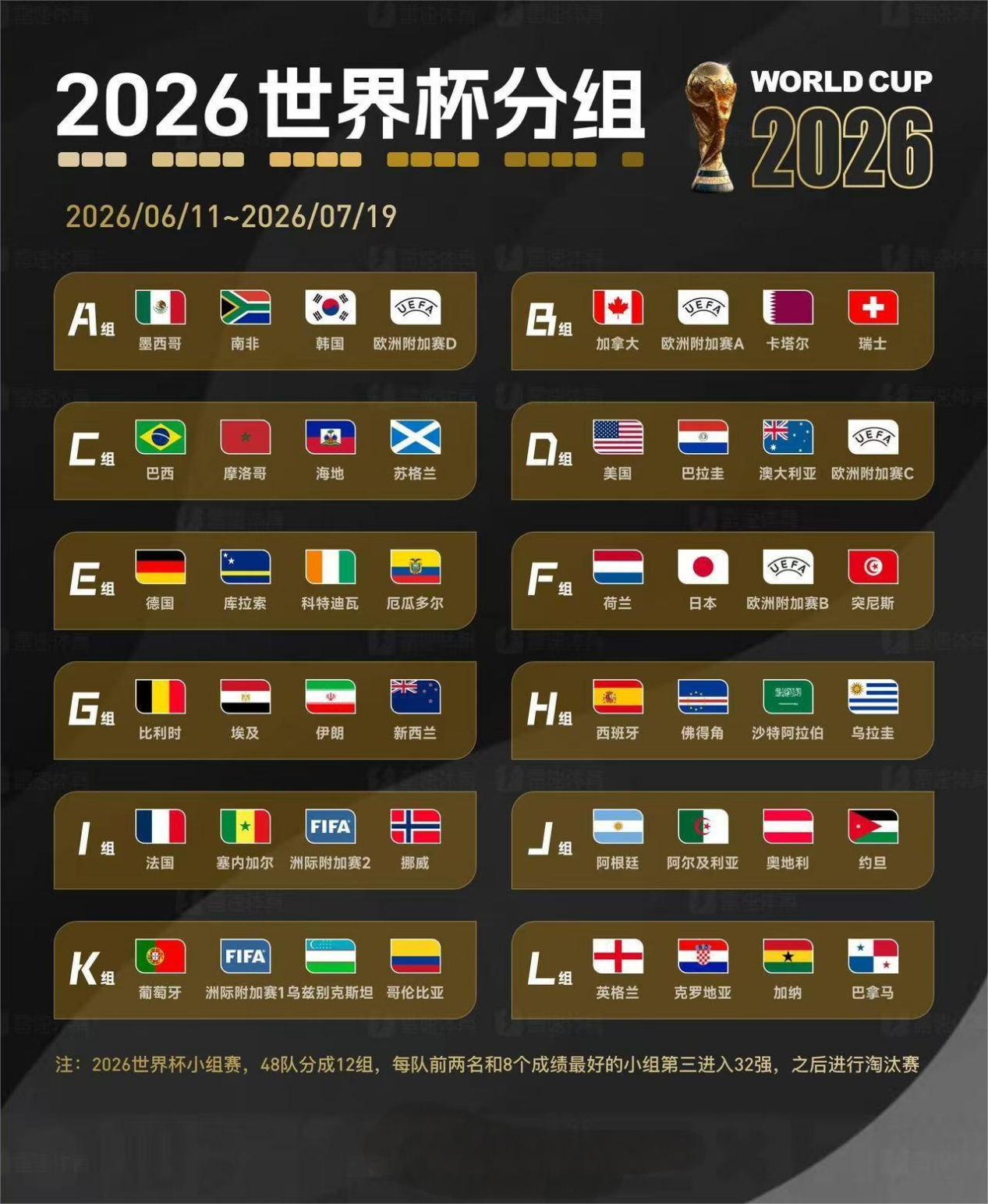 2026年世界杯48支决赛圈参赛队在小组赛被分成12组,每组4支球队,每队前两名和8个成绩最好的第三名晋级32强,随后进行淘汰赛,直到决出冠军。