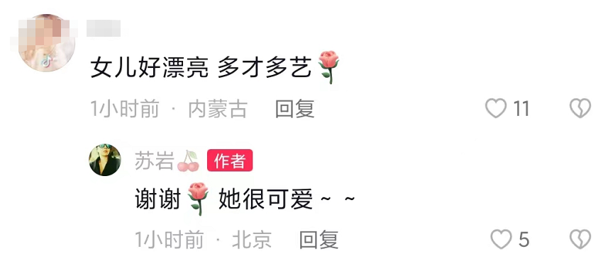 网友们看了视频后,纷纷留言大赞女儿好漂亮,多才多艺。苏岩表示谢谢,并夸自家女儿很可爱。看得出来,她以女儿为荣。