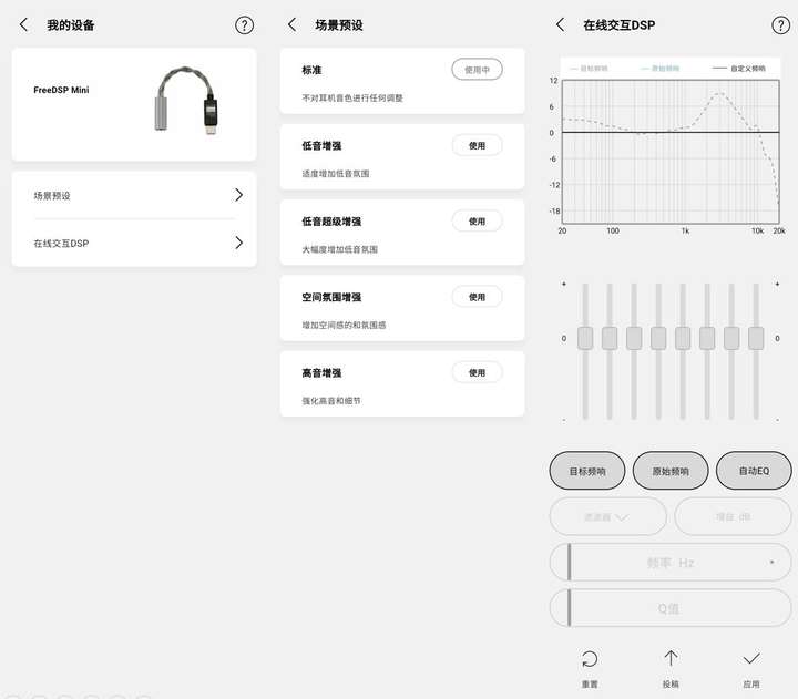 当然,FreeDSP Mini的最核心功能,水月雨第二代在线交互式DSP也属于是可用度和可玩性的新升级,不论你是手机移动端使用APP还是电脑PC端使用Web访问,都能获得相当专业,自由度极高的数字调音台体验,得益于自家产品序列的数据库共享策略,凭借在线交互DSP基本可以实现在水月雨宇宙当中,纵情徜徉,除了丰富的调音预设和频段自定义之外,你甚至可以通过选择原始曲线和目标曲线,直接实现一键自动EQ,高效低成本魂穿体验你感兴趣的设备声音。