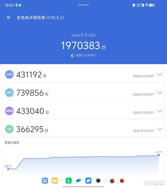 在性能配置上,vivo X Fold5搭载了第三代骁龙8移动平台,配合LPDDR5X内存与UFS 4.0闪存,性能表现自然不必多说,安兔兔跑分也达到了近200万。