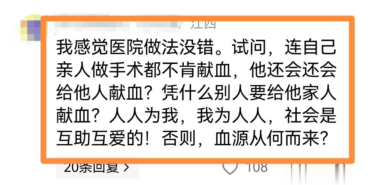 另一位网友说,觉得医院做法没错,试问,连自己亲人做手术都不愿意献血,那还会给他人献血吗?社会是需要互助互爱的,人人为我,我为人人。否则,血源从何而来?