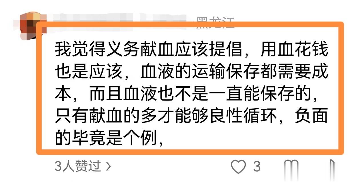 就如这位网友所说,义务献血应该提倡,用血花钱也是应该的,血液的运输保存都需要成本,而且血液也是有保质期的,只要献血的多才能够良性循环。