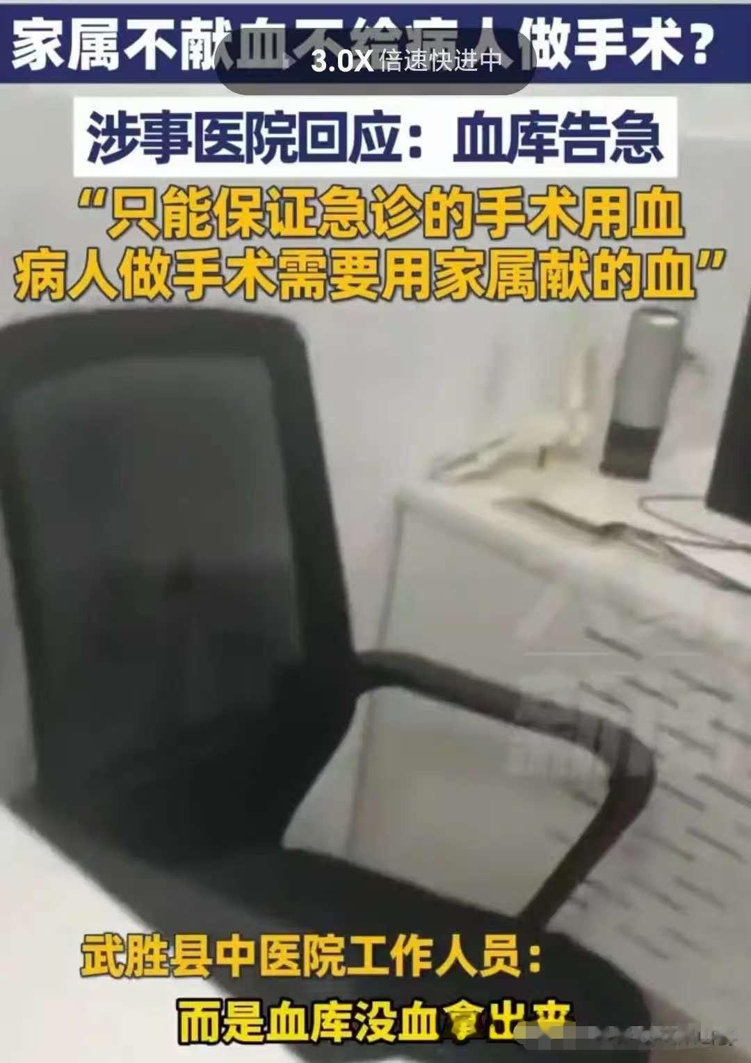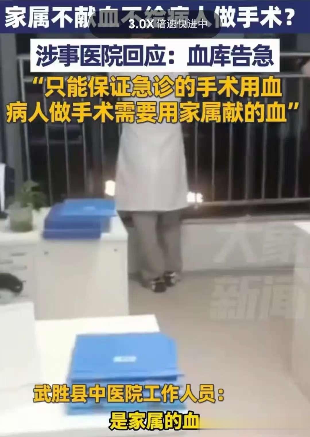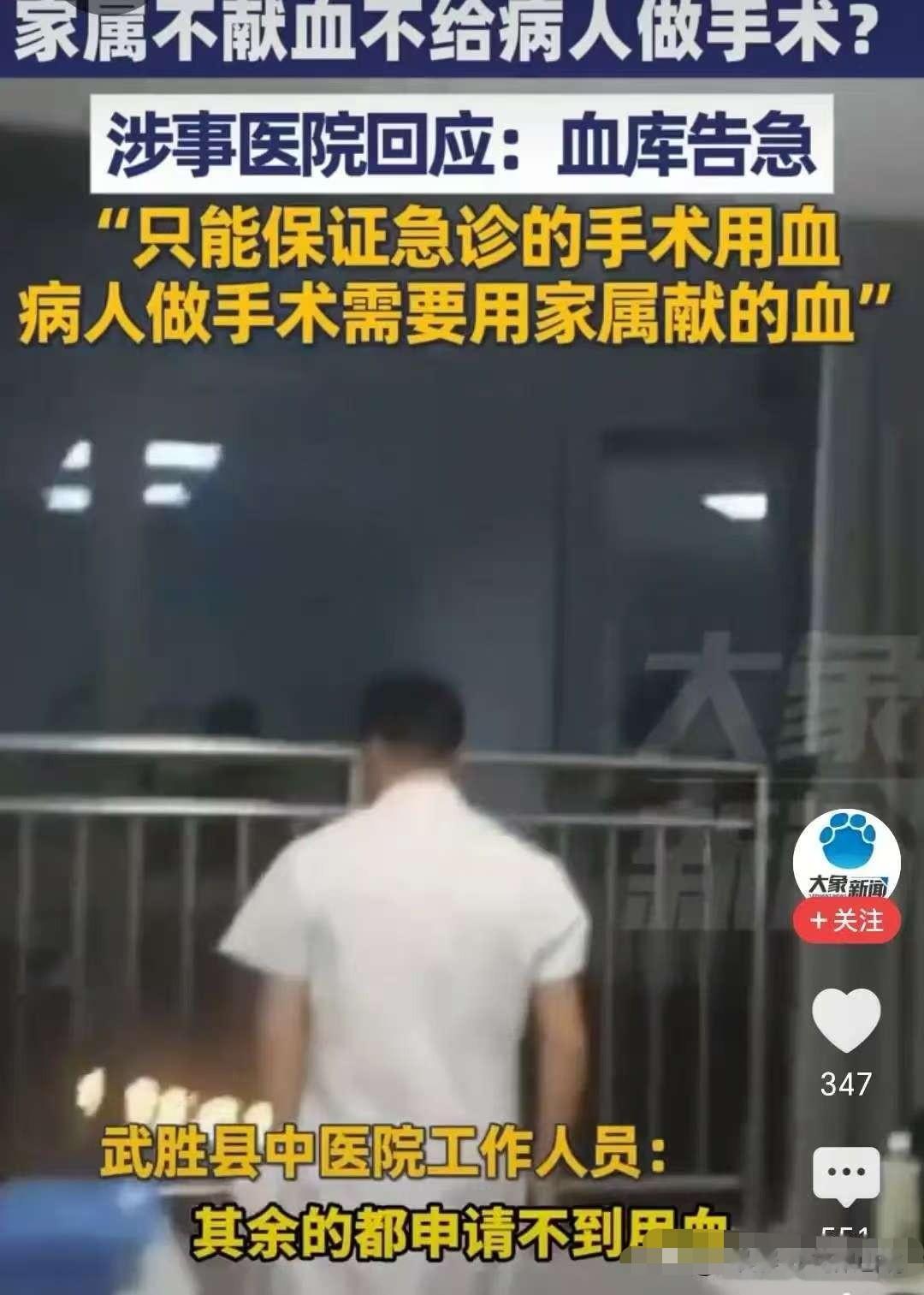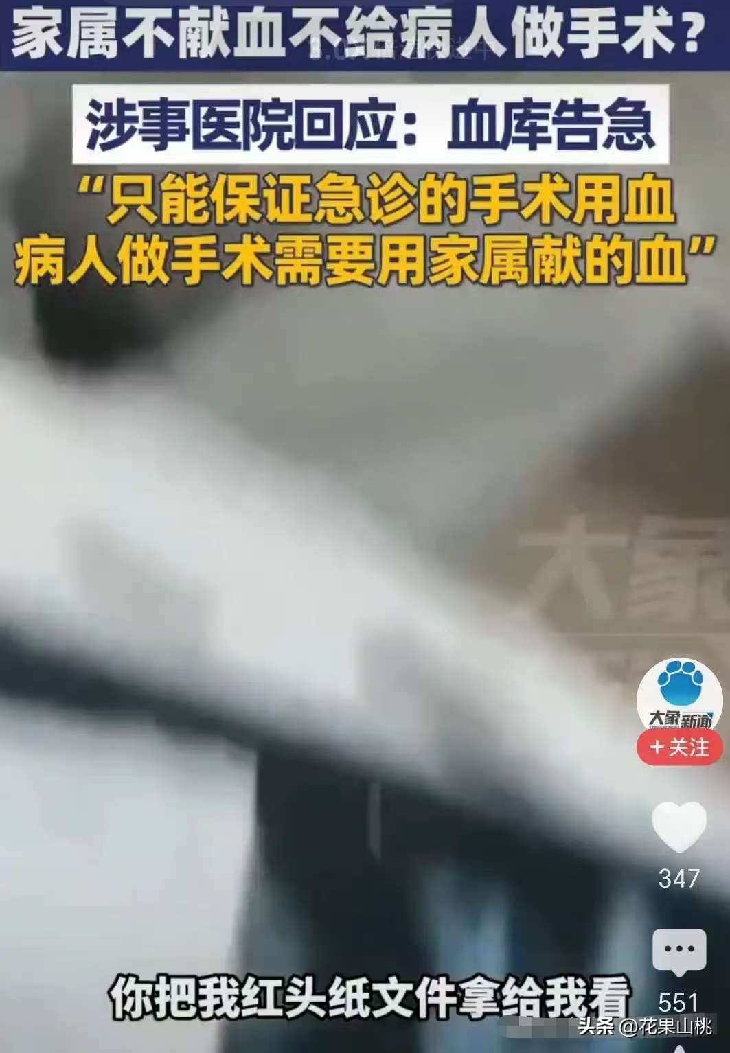 发布视频的是一位患者家属,称自己家人在医院住院,需要手术治疗,院方与家属沟通让家属献血,才能安排手术。