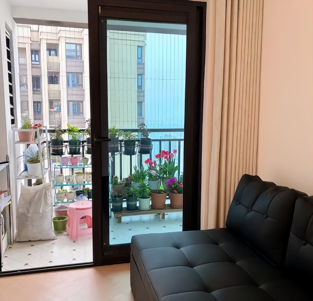 客厅外的阳台,全部密封好,平时可以扩大家里的面积,让整个客厅看起来更加的通透、宽敞;次卧的阳台就变成了家里的小花园。