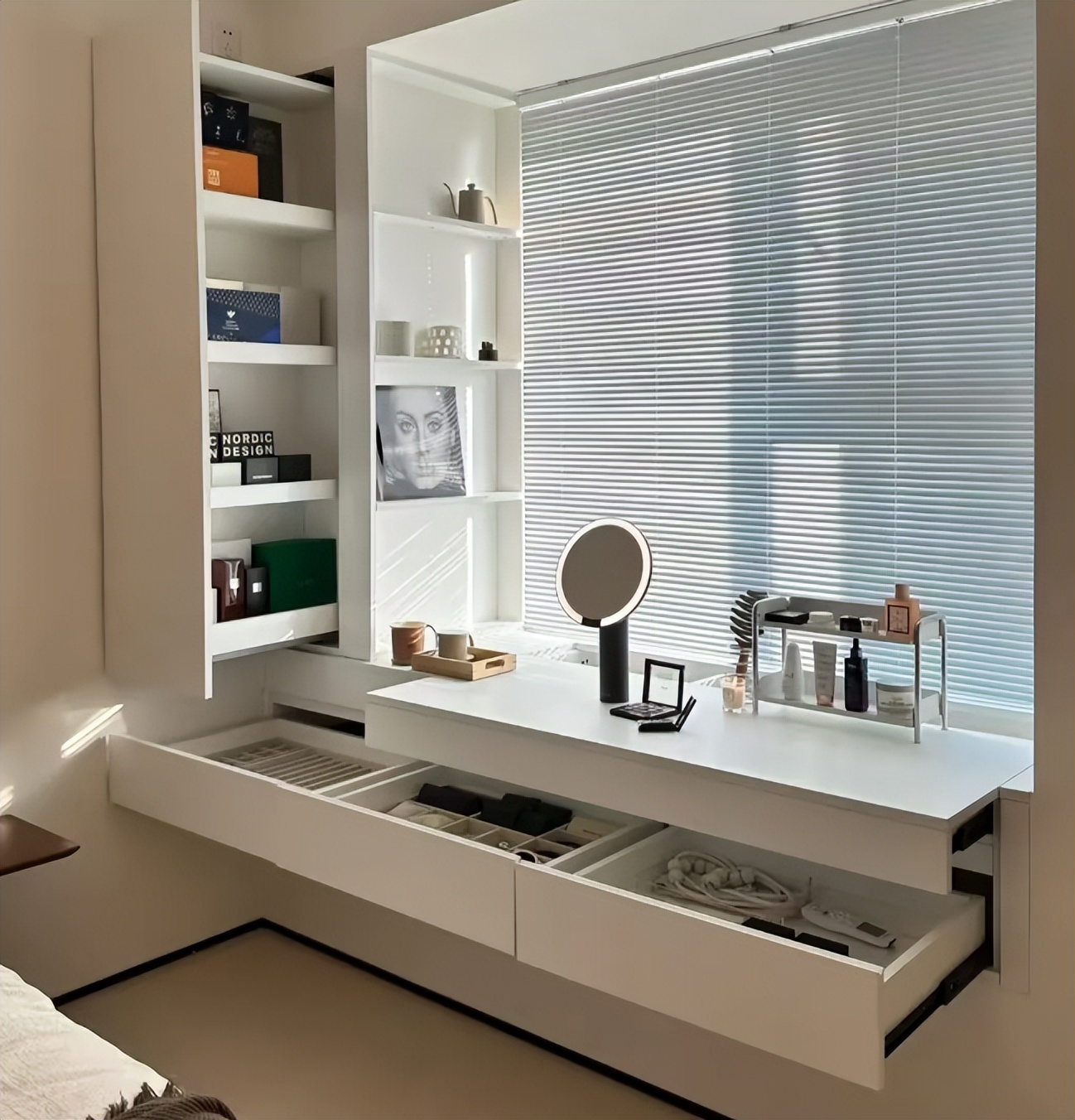 我是直接在飘窗上定制了两层抽屉,下面一层是常规抽屉,可以用来装一些小格子装首饰;