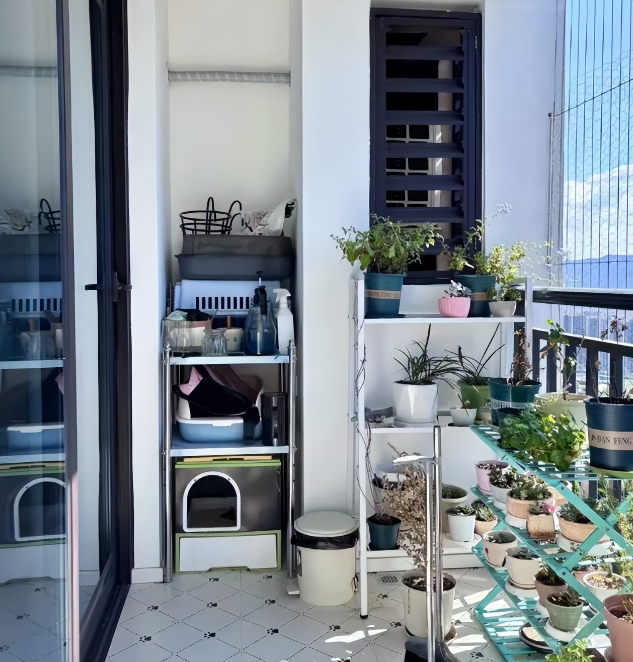 家里的房子,正好是双阳台,于是装修的时候,干脆把它一分为二,阳台一部分做成落地窗,一部分不封窗户,做成一个开放式的小花园。