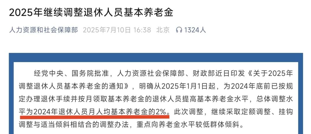 明确从2025年1月1日起,为2024年底前已按规定办理退休手续并按月领取基本养老金的退休人员提高基本养老金水平,总体调整水平为2024年退休人员月人均基本养老金的2%。