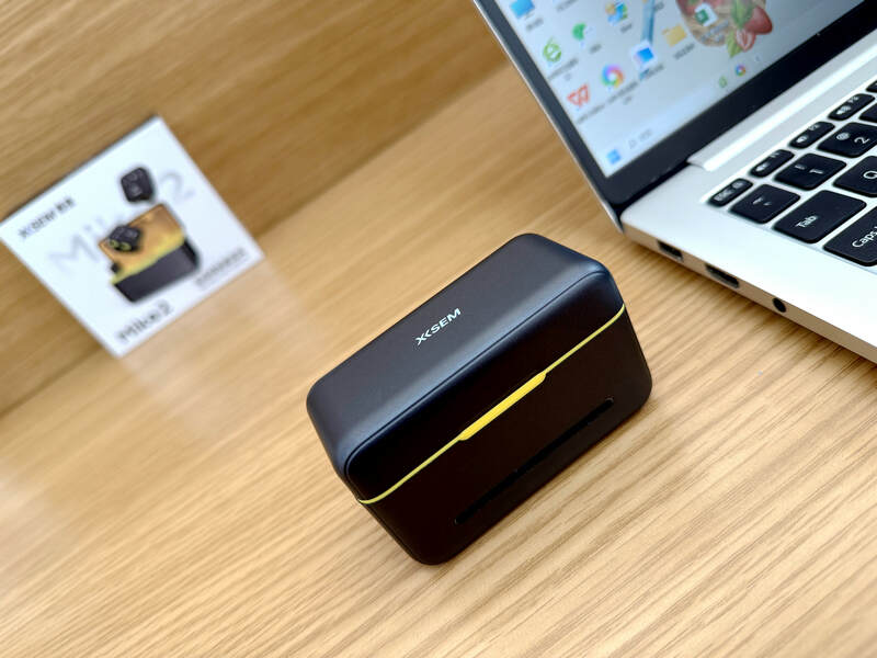充电仓内部是黄色内衬,接收器和发射器坐落整齐,独立收纳,通过磁吸吸附收纳盒充电,方便快捷。
