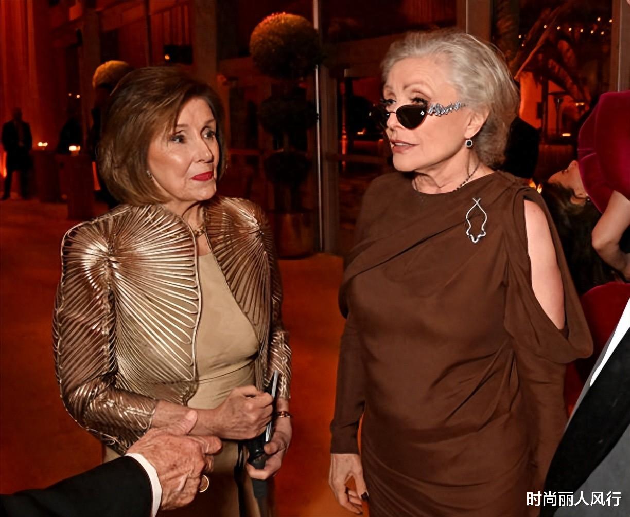 水波纹的图案,隐约打造出动感的氛围感,佩洛西被帅气的男士搭着肩膀,到处和明星各种合影,完全不服老。