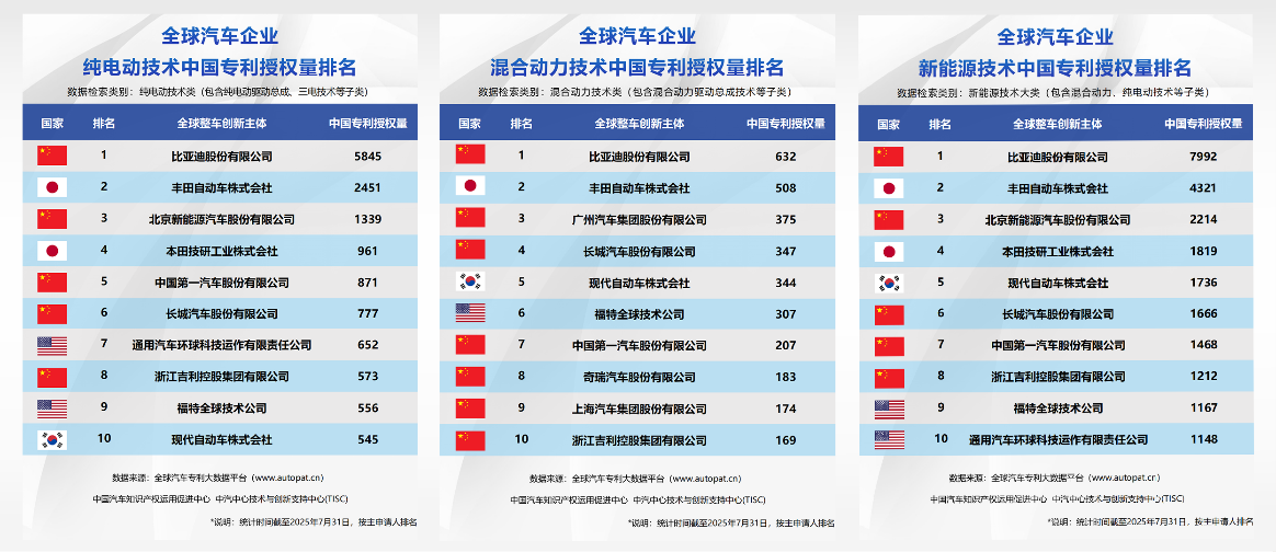 在“全民智驾”战略推动下,仅半年时间,搭载“天神之眼”的车型销量突破120万辆,使比亚迪成为中国智能驾驶车型销量第一的车企。此外,比亚迪在新能源、混动、纯电三大技术领域的中国专利授权量均位列全球第一,进一步巩固了其技术领导者的地位。