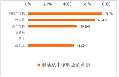 在“继续从事该职业的意愿”调查中,网约车司机比例最高,为75.7%;高于外卖员(68.4%)和货车司机(50.29%)。