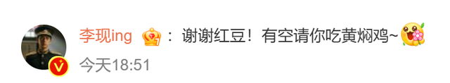 他回复刘亦菲的是,谢谢红豆。红豆是刘亦菲与李现合作的《去有风的地方》中的角色名,李现亲切的称呼刘亦菲为红豆,可见他对和刘亦菲的合作依然有很深的印象。