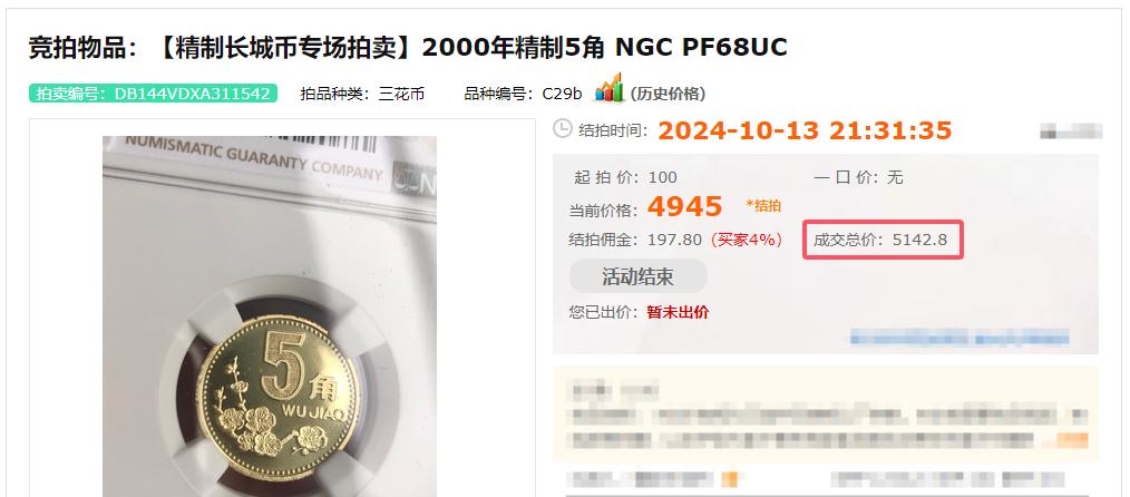 而最具有价值的还要数关门梅花五角,2000年分没有对外发行,所以这枚很少有人能收藏到。价格就更高了,下图的拍卖中即将突破5000大关