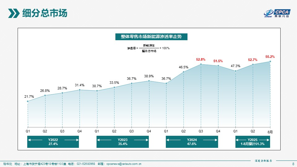 比如,2019年国补退坡50%,但国内乘用车市场新能源渗透率从上一年度的4.8%提升到了4.9%,之后三个年度进一步提升至5.8%、14.8%和27.4%。而在2022年底国补彻底退出后,乘用车市场新能源渗透率更是持续攀升,2023年至35.4%,2024年至47.6%,今年1-8月更是高达51.3%。