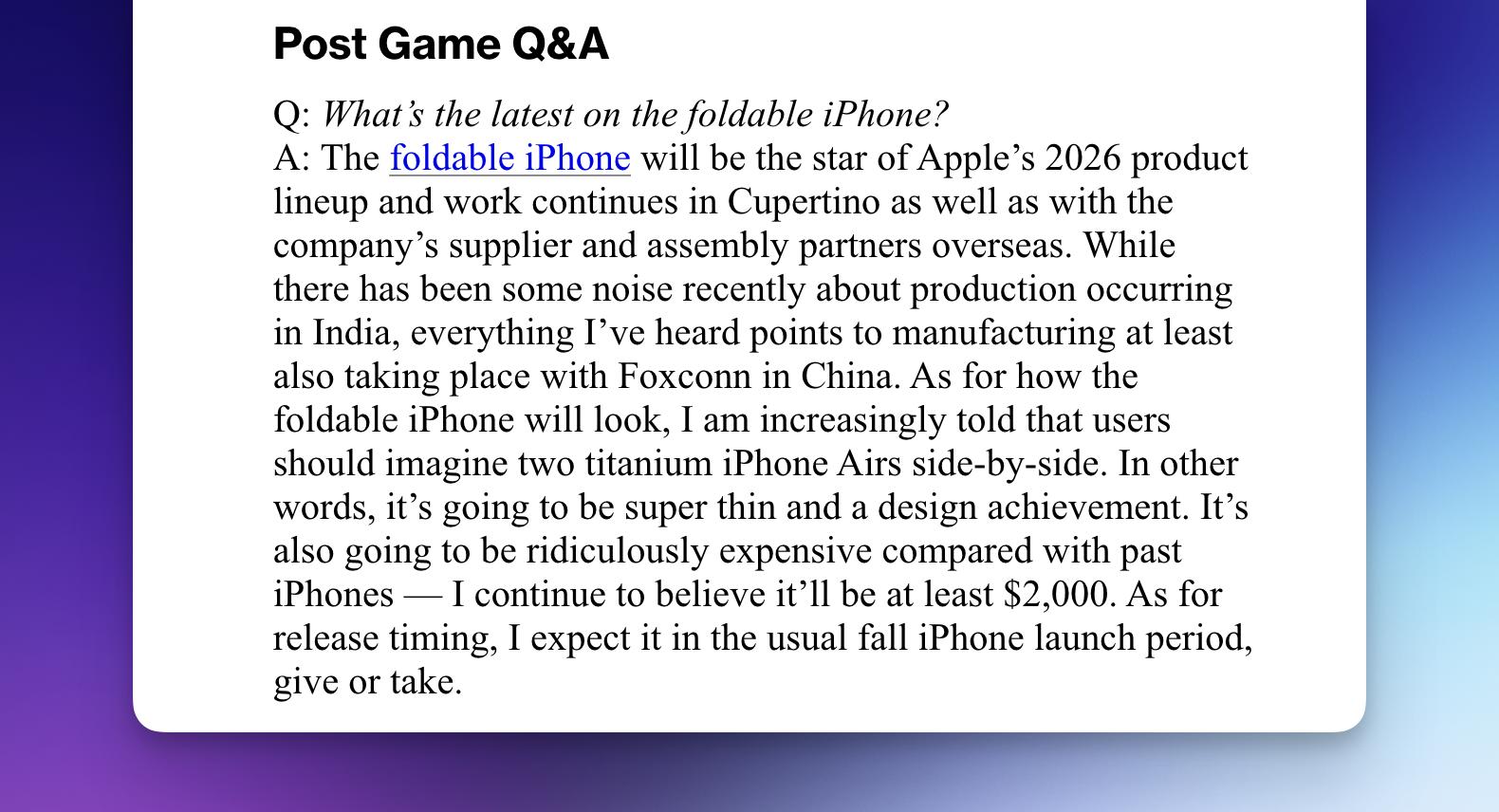 此外,Gurman 还提到,尽管近期有传言称这款折叠屏 iPhone 可能由富士康在印度生产,但他认为富士康仍将在中国完成生产。同时,他预计这款设备的发布时间定在 2026 年,依然会是苹果传统的秋季发布会期间。
