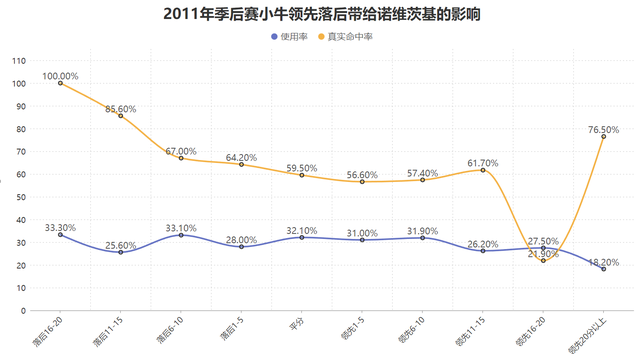 其次诺维茨基这一次季后赛非常擅长处理逆风球,无论球队领先还是落后诺维茨基都有着相对稳定的使用率,同时在球队落后时诺维茨基的真实命中率有着更高的水准,这意味着小牛落后对手时诺维茨基在消耗的出手机会稳定的情况下真实得分效率会更高,这一年季后赛的诺维茨基用一次冠军改变了人们的偏见与质疑。