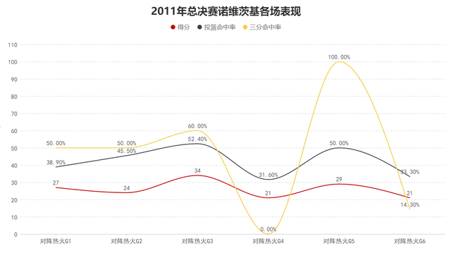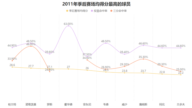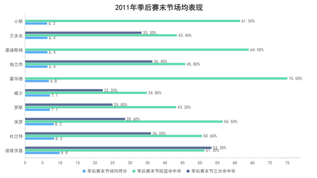 基础数据提升的同时诺维茨基的高阶数据更加夸张,他季后赛的进攻效率达到了112.2,防守效率为102.5较为一般但他的净效率依然达到了9.7,这意味着当诺维茨基在场时球队每百回合可以净胜对手9.7分,这个净效率依然位于各个球队核心球员中的第一高,这也可以表明即使防守没有达到最高级别,但论在场正面作用诺维茨基就是2011年季后赛的最强之人。
