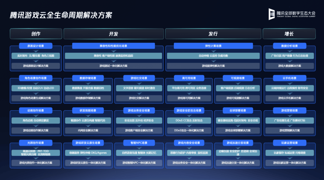 在此背景下,腾讯云于本届数字生态大会上全面升级“游戏全生命周期解决方案”,通过领先的AI技术与全球化的云基础设施,为游戏开发者提供从创意诞生到全球增长的一站式护航。