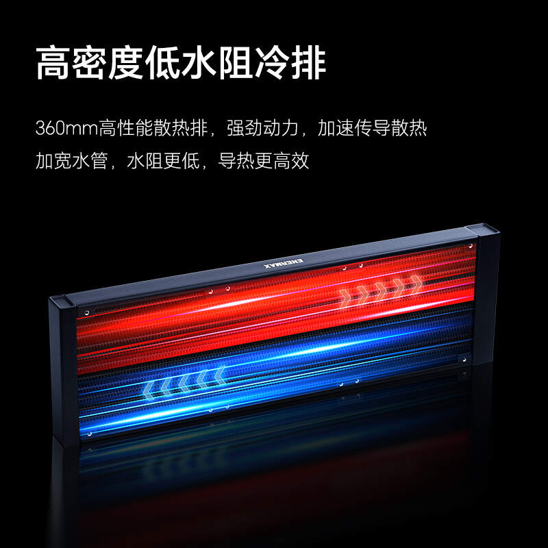 散热器的水泵设计也经过精心优化,采用强力EF1水泵设计,能够提供450L/h的高流速,确保水冷系统长时间运行稳定。为了更好的散热,XTR360还采用硬核的分流通道技术,让冷水直冲铜底,直接将热量一分为二,带来更高效的散热。