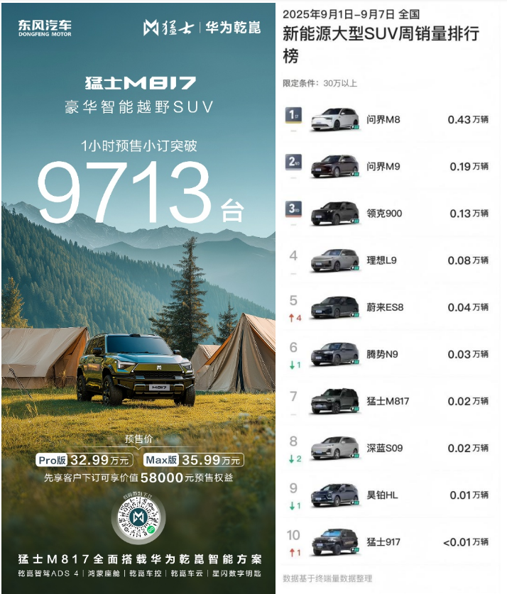 东风猛士科技与华为自签约以来,合作迅速开花结果。2025年4月22日,双方联合推出的“豪华智能越野SUV”猛士M817迎来全球首秀;7月17日,猛士M817开启预售,取得1小时9713台的预售战绩;8月17日,猛士M817上市以来,销量持续火爆,同时口碑还获得同级车第一,实现销量口碑双丰收。