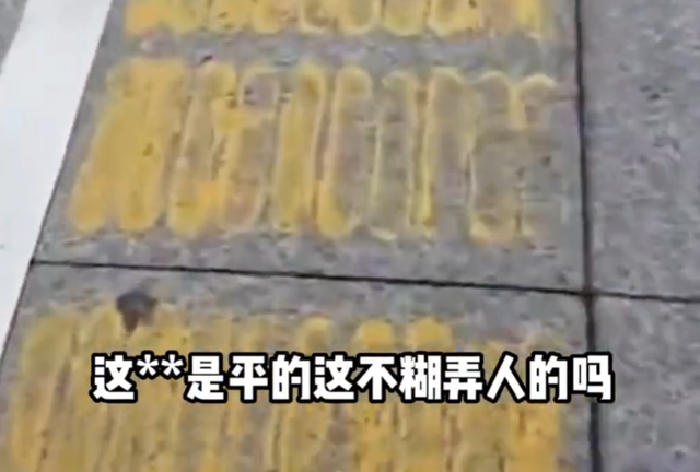 从视频中可以看出,道路上的地砖贴有两条黄色的盲道,背面的胶水都已经干了,仅有一层皮,像贴纸一样一撕就掉。