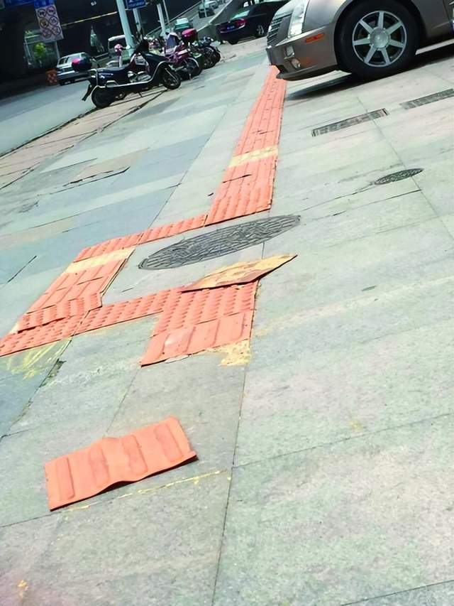 许多塑面贴歪斜、脱胶,起不到盲道的作用,沦为了摆设。