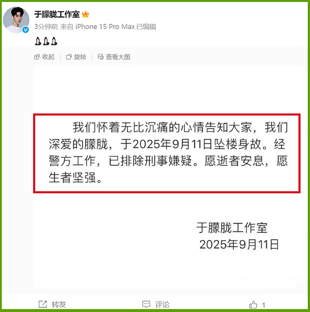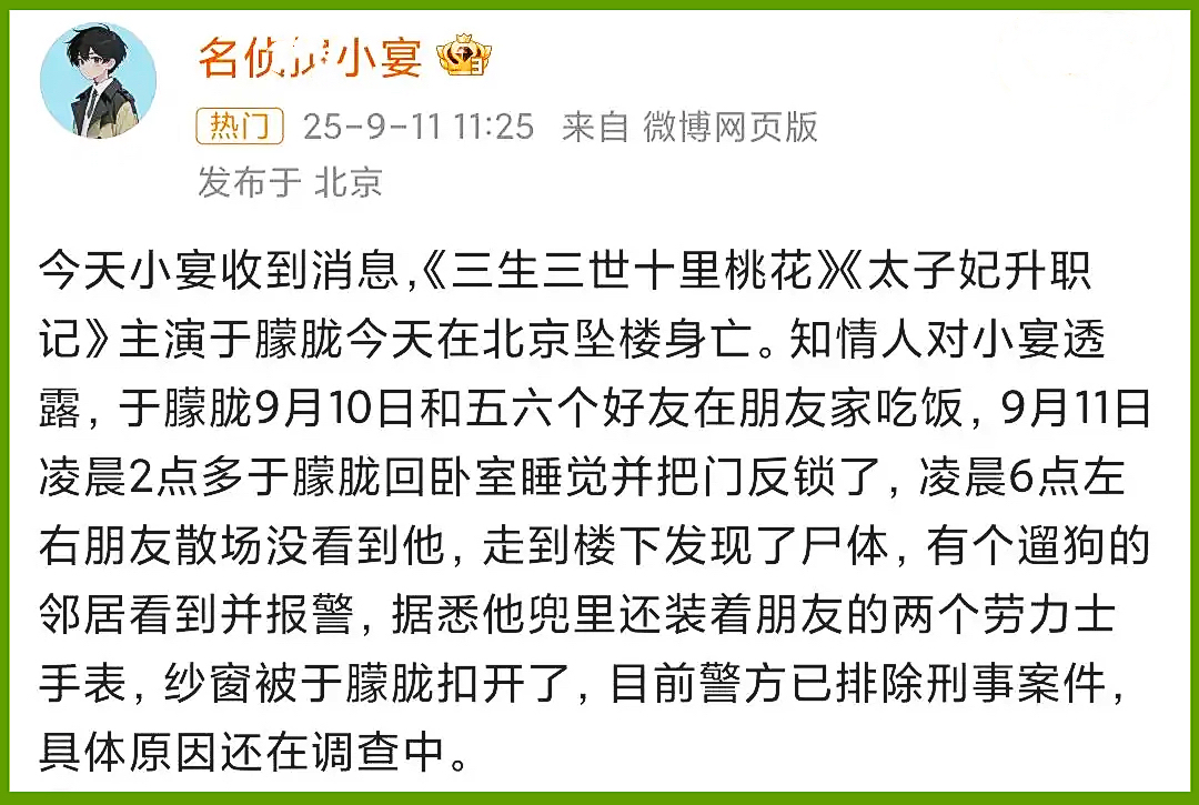 就在9月11日晚间19时许,于朦胧工作室发文,正式回应此事,文章证实,于朦胧于2025年9月11日坠楼身故。并称,经警方工作,已排除刑事嫌疑。