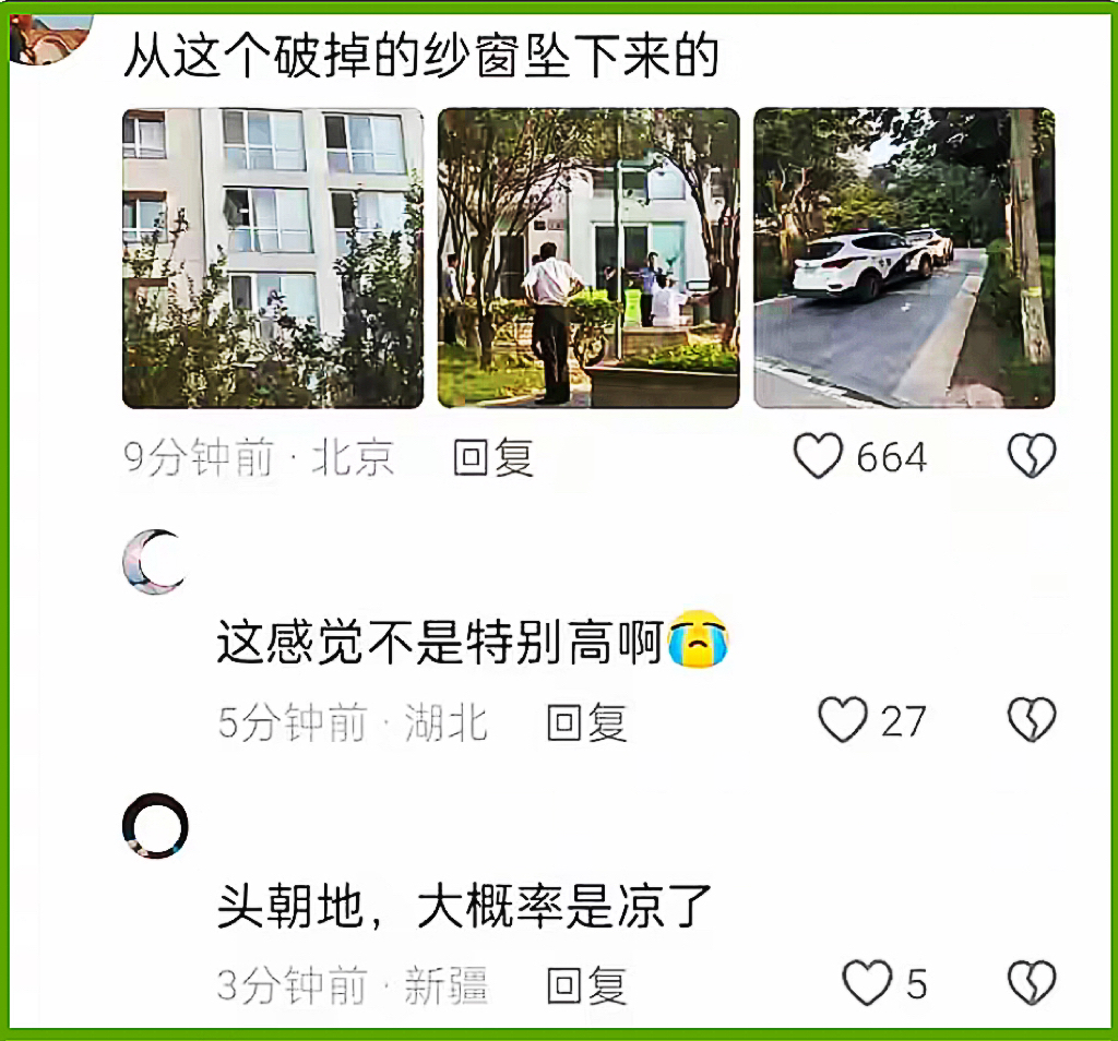 据一位知情者爆料,于朦胧坠楼小区为北京朝阳区的阳光上东小区,该网友还曝光了事发现场的三张照片:一张是警方在楼下处置的照片;另一张是疑似于朦胧破窗跳楼的窗户照;还一张是警车赶到现场的照片。