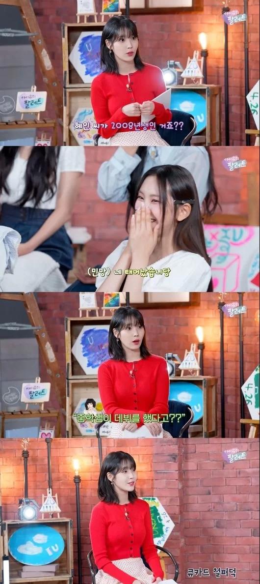 1993年出生的IU,今年迎来出道15周年,NewJeans成员作为嘉宾出演了《IU的调色板》。IU对 2008年出生的NewJeans成员李惠仁(HYEIN)的年龄感到惊讶。