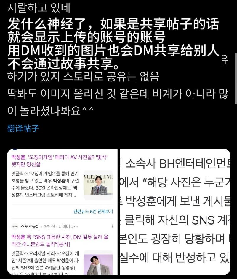 虽然但是,网友认为误传的可能性十分小,因为如果是确认私信的话,也只会通过私信共享给别人,不会通过限动分享~如果是共享帖子的话,转发也会显示原账号的账号名字,但是朴成焄这个却没有任何其他人的账号,经纪公司说法根本不成立!