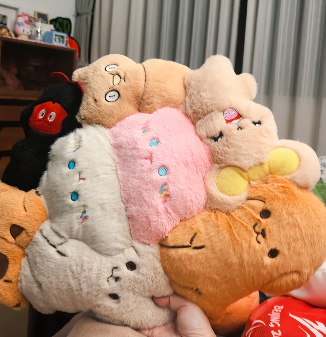 先把家里这种扁扁的毛绒玩具找出来,然后简单组合一下,直接用针线缝起来。