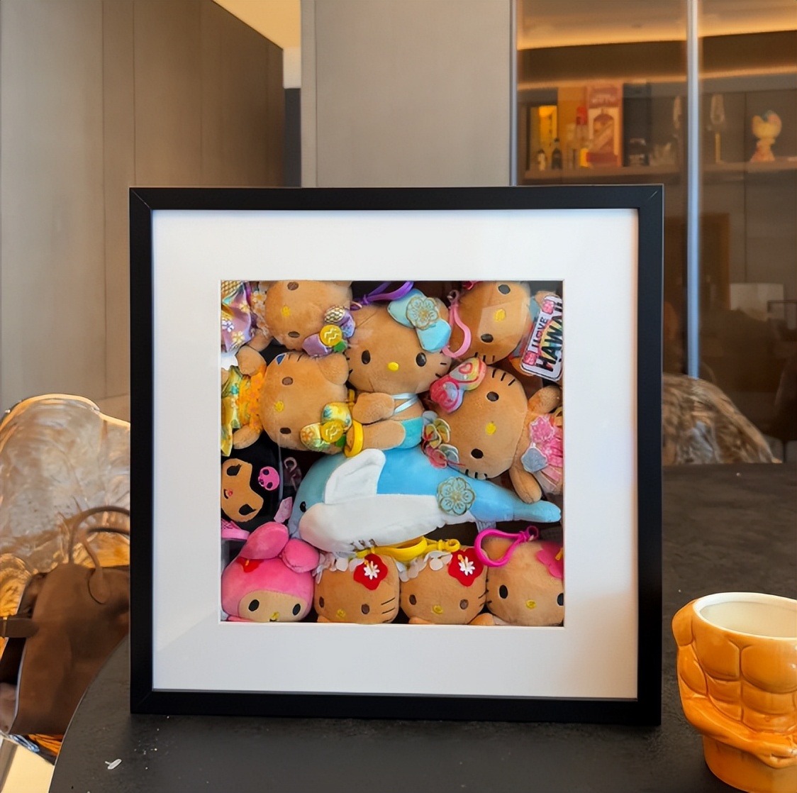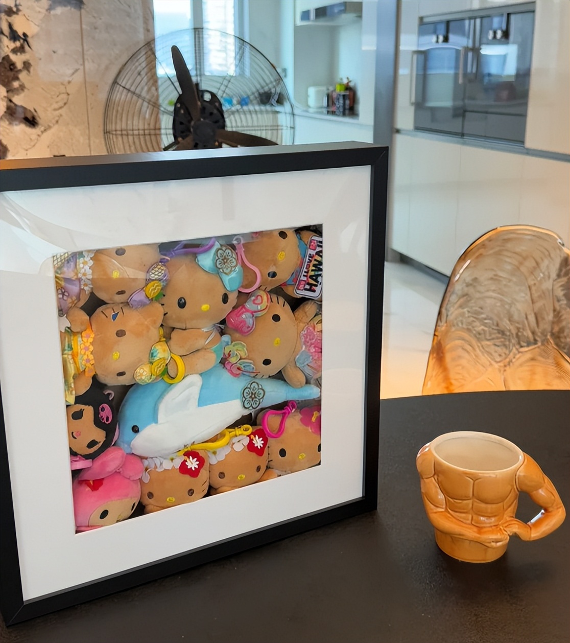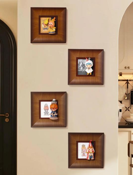 家里如果有盲盒的话,也可以把盲盒做成装饰画,只需要准备几个相框,把盲盒粘贴在上面就搞定了。