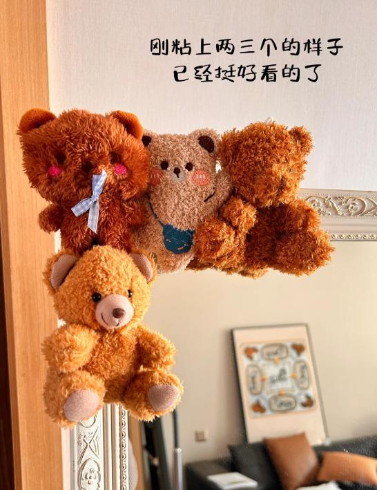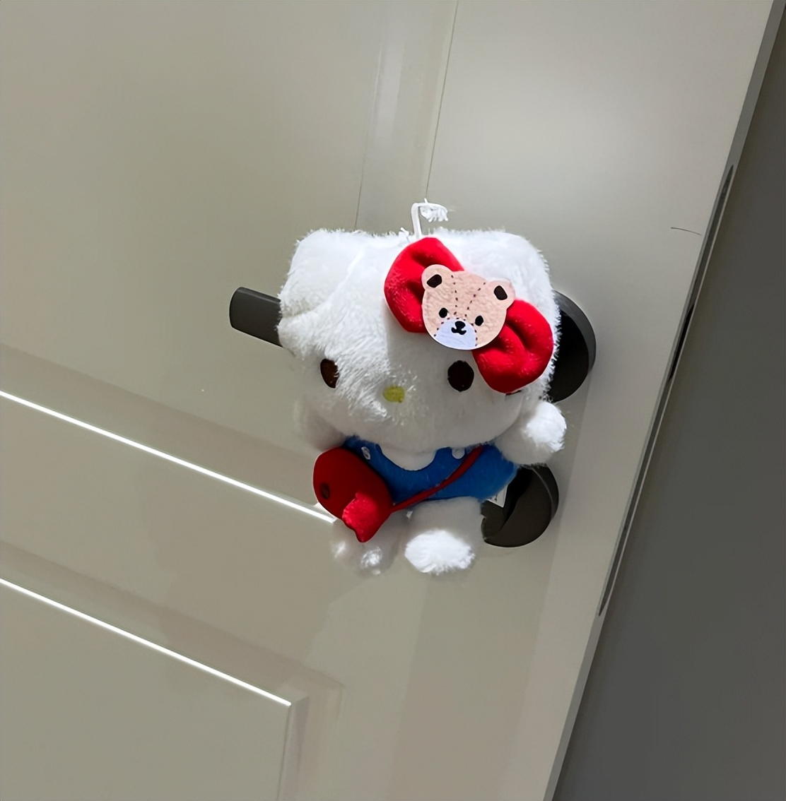 直接把这些毛绒玩具绑在门把手上,这样开门的时候门把手就不会撞到墙了,防撞贴也不用买了。